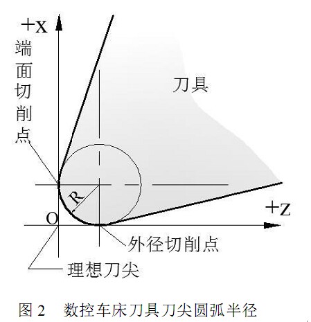 通過上面的刀具位置尺寸補償,我們已將數(shù)控編程的坐標(biāo)點設(shè)置在了刀具刀尖點上。但為了提高刀具的使用壽命和降低加工工件的表面粗糙度,通常將刀尖磨成半徑不大的圓弧,一般圓弧半徑尺寸在0 . 4 ~ 1. 6 mm 之間,如圖 2 所示。很顯然,假想刀尖點與實際切削點是不同點,當(dāng)加工與坐標(biāo)軸平行的圓柱面和端面輪廓時,刀尖圓弧并不影響其尺寸和形狀。但當(dāng)加工錐面、圓弧等非坐標(biāo)方向輪廓時,刀尖圓弧將引起其尺寸和形狀誤差,而且刀尖圓弧半徑越大,誤差越大。這種誤差的大小不僅與輪廓形狀、走勢有關(guān)。而且與刀尖圓弧半徑有關(guān),當(dāng)零件加工精度要求較高時,就可能出現(xiàn)超差,所以如果在數(shù)控加工或數(shù)控編程時不對刀尖圓角半徑進行補償,僅按照工件輪廓編制的程序來加工,勢必會產(chǎn)生加工誤差[ 1]。