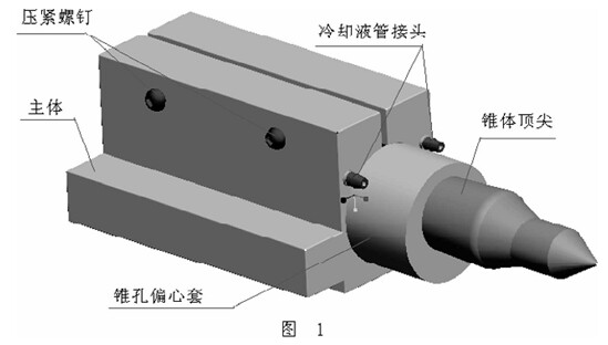主體是鉆具與刀架的連接體,它既起到連接刀架的作用。其剛面為一壓緊凸臺,用以與刀架連接時的壓緊。主體結(jié)構(gòu)的中心為一配合圓孔,圓孔的尾部為一止推環(huán),用以防止偏心套的軸向位移。圓孔的正上方為一松緊槽,用以對錐孔偏心套實(shí)施壓緊。與槽垂直的側(cè)向上有兩個鎖緊螺紋,當(dāng)用螺釘擰緊鎖緊螺紋時,與孔相連的松緊槽就會收縮,從而使偏心套得以夾緊。在切削過程中,對加工刀具和工件的冷卻尤其重要,冷卻的好壞,有時直接影響加工工件的質(zhì)量,為此,為能得到很好的加工冷卻,我在主體圓孔的左右兩側(cè)均設(shè)計(jì)了一冷卻液接頭,主體上的冷卻液接頭通過主體的過孔與機(jī)床的冷卻液管連接,從而使切削過程得以充分的冷卻。