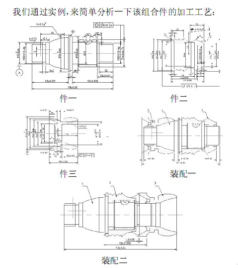 首先: 一看零件圖是組三件套, 要考慮先加工那件零件的那部分其次再加工那部分,對(duì)這套組合零件的加工順序在頭腦中有一個(gè)清晰的了解。其次該零件圖中的宏程序比較多。再次要考零件的配合精度、形位公差及裝配尺寸。最后在保證各方面多達(dá)到加工要求后, 提高加工的效率。