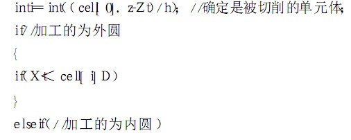 讀入經(jīng)過(guò)程序處理模塊得到的仿真驅(qū)動(dòng)信息,即刀具運(yùn)動(dòng)信息,得到車(chē)刀刀尖處的位置( , ) ,根據(jù)Z t確定刀具經(jīng)過(guò)的小圓柱單元在工件數(shù)組中的位置,也就是確定哪個(gè)單元體被切削. 然后比較該單元體的直徑和刀尖點(diǎn)的X t坐標(biāo),確定該單元體是否被切削.具體的實(shí)現(xiàn)命令如:
