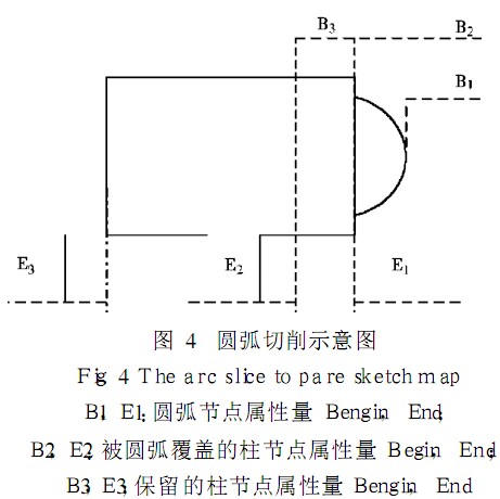 該節(jié)軸只需繪制一次,將繪制結(jié)果存入該節(jié)點(diǎn)的顯示列表即可,后面的節(jié)點(diǎn)涉及被圓弧覆蓋的部分,長(zhǎng)度由B2到E2. 隨著切削的進(jìn)行,每次屏幕刷新前只需將被覆蓋柱與圓弧進(jìn)行重畫(huà),生成該節(jié)點(diǎn)新的顯示表,軸的其他各節(jié)顯示表不變. 隨著圓弧不斷變長(zhǎng),即圓弧節(jié)點(diǎn)屬性E ( ) 值變大,被覆蓋柱節(jié)點(diǎn)不斷變短,即其屬性 ( 2) 值變大,直至柱節(jié)點(diǎn)的 ( 2) 等于A ,刪除該柱節(jié)點(diǎn),圓弧即加工完畢.