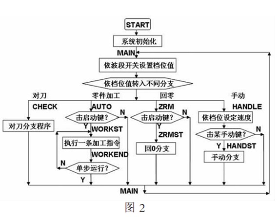 由圖 可見有零件加工 手動(dòng) 回零 對(duì)刀等四個(gè)功能程序段 另外還有三段中斷服務(wù)程序 控制加工速度的定時(shí)器 中斷服務(wù)程序 實(shí)現(xiàn)暫停功能的外部中斷 中斷服務(wù)程序 實(shí)現(xiàn)入群的通信程序 串行口中斷服務(wù)程序