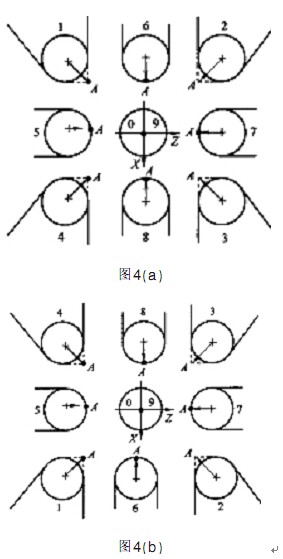 根據(jù)車刀的形狀確定位置參數(shù),數(shù)控車削使用的刀具有很多種,不同類型的車刀其刀尖圓弧所處的位置不同,如圖所示〔)將車刀的形狀和位置用刀尖方位參數(shù)T來表示,A點為假象的刀尖點,刀尖方位參數(shù)共有8個(n -g) >當(dāng)使用刀尖圓弧中心編程時,可以選用?;?/span>9})圖(a)為刀架前置的數(shù)控車床假象刀尖的位置;圖((b)為刀架后置的數(shù)控車床假象刀尖的位置、