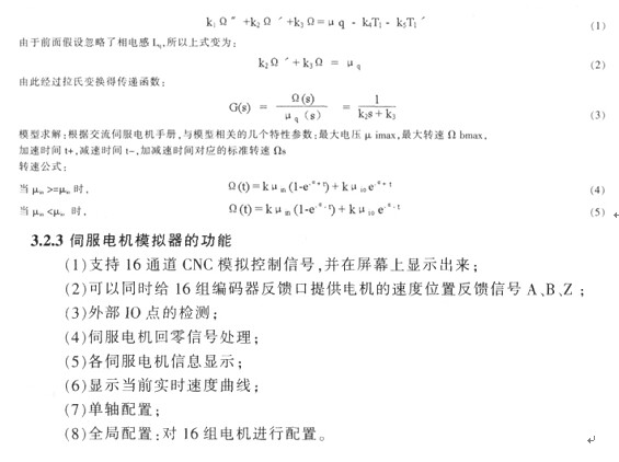 伺服模擬器的各個(gè)參數(shù)是從各種不同種類的伺服電參數(shù)中抽取出來(lái)的, 這一特性實(shí)現(xiàn)了對(duì)各種不同型號(hào)的伺電機(jī)的模擬。除此之外, 伺服模擬器還可以對(duì)系統(tǒng)極端情下臨界值進(jìn)行測(cè)試, 解決了真實(shí)伺服電機(jī)測(cè)試臨界值的題。其中在伺服電機(jī)的控制性能方面, 模擬器的隨動(dòng)誤差真實(shí)電機(jī)相當(dāng)。伺服模擬器實(shí)現(xiàn)了對(duì)伺服電機(jī)的真實(shí)模數(shù)控系統(tǒng)在控制伺服模擬器時(shí)無(wú)法分辨連接的是模擬器是伺服電機(jī)。