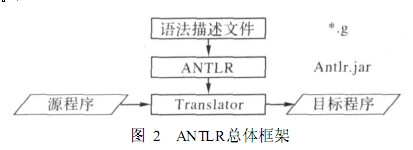 ANT LR總體框架如圖 2所示。在使用 Antlr時(shí) ,要先創(chuàng)建一個(gè)稱為語(yǔ)法文件的文本文件 (. g文件 ) , 將自定義的詞法分析器和語(yǔ)法分析器的規(guī)則全部寫在里面。Antlr就是通過(guò)讀取分析語(yǔ)法文件中的規(guī)則來(lái)生成詞法分析器與語(yǔ)法分析器的。Antlr語(yǔ)法文件的工作過(guò)程如下:首先 ,定義詞法分析器 Lexer類 ,在類中定義各種 Token;然后 ,定義語(yǔ)法分析器Parser類 ,在類中使用 EBNF語(yǔ)法 ,遞歸定義各種句子 , Parser類負(fù)責(zé)把讀入的 Token串匹配成句子 ,翻譯出 AST(抽象語(yǔ)法樹(shù) ) ;最后 ,定義用于處理 AST的 TreeParser類 ,根據(jù) Parser類分析出來(lái)的 AST(抽象語(yǔ)法樹(shù) )進(jìn)行動(dòng)作。Antlr語(yǔ)法文件具體組成部分及規(guī)則解析參見(jiàn)文獻(xiàn) [ 6 ]。