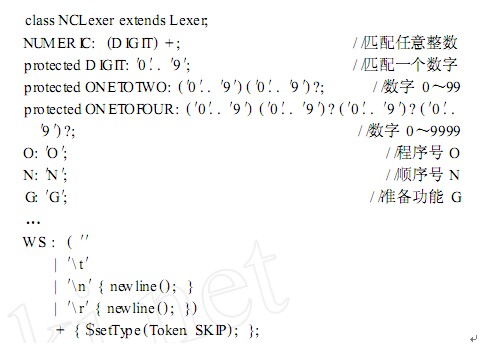 對(duì)數(shù)控程序的源代碼進(jìn)行格式整理的主要任務(wù)是刪除數(shù)控程序中的空白字符、 回車符、 程序注釋等非加工信息字符 ,并將數(shù)控程序轉(zhuǎn)換成便于代碼編譯程序進(jìn)行處理的內(nèi)部格式。在 ANT LR定義的. g語(yǔ)法文件中通過(guò)下面的代碼來(lái)實(shí)現(xiàn)詞法分析器的功能。