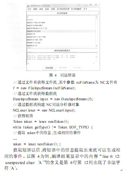 數(shù)控程序中出現(xiàn)非法字符主要指以下兩種情況:第一種情況為含有系統(tǒng)無(wú)法識(shí)別的字符。在本編譯系統(tǒng)中 ,系統(tǒng)可識(shí)別的字符集為 { G, X, Y, Z, H, D, F, O, N, I , J, K,M, S, T,R. , ; , % } ,阿拉伯?dāng)?shù)字 0~99,若數(shù)控程序內(nèi)出現(xiàn)“A” 等字符集所不包含的字符時(shí) ,則認(rèn)為數(shù)控程序含有非法字符。第二種情況是由系統(tǒng)可識(shí)別字符集組成的系統(tǒng)無(wú)法識(shí)別的字符串。這種錯(cuò)誤一般是由于用戶的誤操作造成的 ,包括以下兩種: 1)沒(méi)有相應(yīng)的數(shù)控功能與字符串相匹配 ,如“7100” ,“M890” ,“MFO 1” 等均屬于這種情況; 2)數(shù)值格式輸入有誤 ,如 150正確的表達(dá)應(yīng)為“150 . ” ,但若用戶在中間輸入空格則變成“1 5 0 . ” ,這種情況在本編譯系統(tǒng)中也被視為是數(shù)值格式輸入錯(cuò)誤的一種。