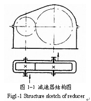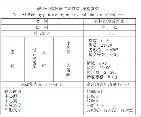 本項目以一級圓柱齒輪減速器作為研究對象,根據文獻[1]通過運動分析 力學分析等,計算得出的結構性能參數列入表 1- 1,其結構簡圖如圖1- 1所示