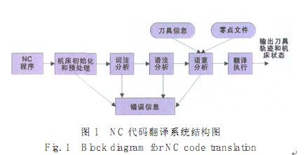 結(jié)合上述 5 個(gè)基本功能和合適的錯(cuò)誤信息管理,就能構(gòu)建一個(gè)良好的針對(duì)特定數(shù)控系統(tǒng)的專用 NC 代碼翻譯器, 我國已有幾家院校如華中理工大學(xué)、 上海交通大學(xué)、 哈爾濱工業(yè)大學(xué)等實(shí)現(xiàn)了某些數(shù)控系統(tǒng)的 NC代碼翻譯器, 應(yīng)用情況良好。但是由于目前數(shù)控系統(tǒng)種類很多, 各種數(shù)控代碼之間差別很大, 因此專用的翻譯器適用面太窄。要解決這一問題, 可以考慮基于模版的翻譯方法, 即由于各數(shù)控系統(tǒng)所完成的各個(gè)功能基本相同, 可以按功能實(shí)現(xiàn)翻譯器, 并對(duì)各功能建立對(duì)應(yīng)的函數(shù)庫, 里面存放不同數(shù)控系統(tǒng)中該功能的實(shí)現(xiàn)函數(shù),這樣實(shí)現(xiàn)的翻譯器就可以動(dòng)態(tài)地適用于多個(gè)數(shù)控系統(tǒng), 是一種通用 NC代碼翻譯器。