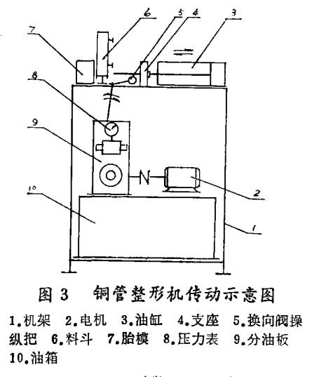 工作時操縱手動換向閥,使活塞桿往復(fù)運動,將料斗內(nèi)的銅箍擠入胎模,整形。操作簡單方便,效率高,質(zhì)量好。