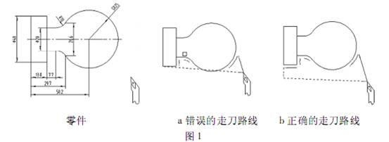 外圓刀經(jīng)常撞刀現(xiàn)象如圖1 這種情況,主要在退刀的過程中 G00 走刀路線是折線或者是直線而且進給速度快并且不受操作者控制,本例中刀具加工到 40 這個外圓后進行退刀,在其刀具退回目標(biāo)點時移動路線中與 S25 球發(fā)生干涉,與工件發(fā)生碰撞,造成撞刀 這個圖的編寫: