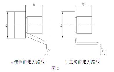 切槽刀常見撞刀現(xiàn)象如圖2 主要有兩種情況: 1 在是進刀過程中刀具與工件 48 外圓發(fā)生干涉,導(dǎo)致零件報廢和刀具碎裂等 2 是退刀過程中刀具退刀路線與工件發(fā)生不應(yīng)有的撞擊 在編寫程序時針對切槽刀應(yīng)注意以下三點就可避免切槽刀撞刀現(xiàn)象發(fā)生: