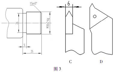 如圖3 C 這樣的一把螺紋刀進行切削加工,在編寫程序時 G92X29. 1 Z 23 F2 中的 Z 23 是沒有考慮到所使用的刀具,Z 值應(yīng)該小于且減去螺紋刀尖寬度的一半,z 值小于25 3 即小于22,在實際編寫中考慮 Z 向?qū)Φ墩`差等因素,這個程序應(yīng)改為 G92 X29. 1 Z 21. 5 F2 ,就可以加工了 如果用的是 D 這樣螺紋刀具在,z 值可以用原來的程序進行加工