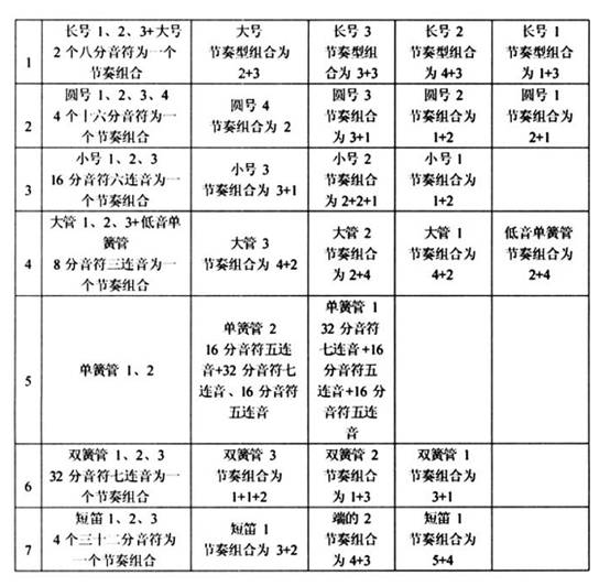 通過上例我們可以觀察到, 各聲部除了開始是一個(gè)二分音符外, 之后的節(jié)奏型主要有四種, 分別為四音組、 三音組、 二音組和一音組, 每個(gè)音組之間用休止符隔開, 按照不同的樂器組,由高到低依次遞減。