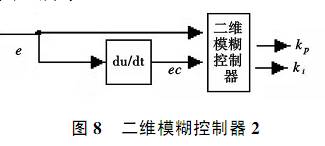 為了減小穩(wěn)態(tài)誤差,考慮位置控制器加入積分環(huán)節(jié).但如果簡單地加入一個普通積分環(huán)節(jié),通過仿真發(fā)現(xiàn),在減小穩(wěn)態(tài)誤差的同時,系統(tǒng)比原來的模糊控制容易出現(xiàn)超調.基于以上考慮,設想積分系數(shù)也用模糊控制器來調節(jié), 以便達到期望的效果.則模糊控制器結構變?yōu)閳D 8所示.