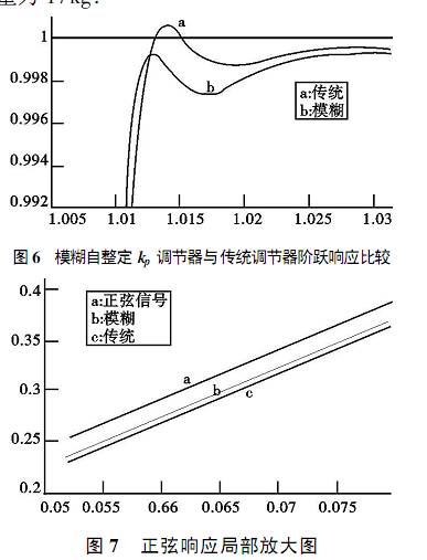 仿真結果如圖 6、 圖 7 所示. 從圖 6 可以看出:采用模糊控制后的系統(tǒng)響應變快,并且不容易產(chǎn)生超調.負載為 17kg 時, 傳統(tǒng)控制已出現(xiàn)較大超調,但模糊控制還沒出現(xiàn). 精密數(shù)控機床是不允許出現(xiàn)超調的,一旦出現(xiàn), 產(chǎn)品將成為次品.但是模糊控制的穩(wěn)態(tài)誤差比傳統(tǒng)誤差大,分析原因,主要是在設置模糊規(guī)則的時候, 為了在負載較大時,響應依舊不出現(xiàn)超調,當誤差為PS 時, $ kp 為ZO 或PS,相對應的kp 值較小,穩(wěn)態(tài)誤差自然大.從圖7 可以看出:自調整位置增益模糊控制后系統(tǒng)的跟隨性比傳統(tǒng)控制好.