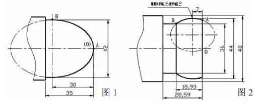 如圖2 所示零件,該零件編程時(shí)以其右端中心 O 點(diǎn)作為編程原點(diǎn),此例如用橢圓極坐標(biāo)方程,則要分別計(jì)算出 A和B點(diǎn)處的橢圓極角,很麻煩 從零件圖給出的尺寸可知 A點(diǎn)對(duì)應(yīng)的橢圓長(zhǎng)軸值為 7mm, B 點(diǎn)對(duì)應(yīng)的橢圓長(zhǎng)值為 11.93 mm(18.93- 7=11.93),因此我們可以將橢圓長(zhǎng)軸設(shè)為自變量,數(shù)值由 A點(diǎn)的 7mm 逐漸減少到 B 點(diǎn)的- 11.93mm,然后根據(jù)橢圓直角坐標(biāo)標(biāo)準(zhǔn)方程,求得所對(duì)應(yīng)的短軸變化值,最后再算出橢圓 AB 段每個(gè)點(diǎn)在工件坐標(biāo)系中對(duì)應(yīng)的X值和 Z值,從而加工出該零件的橢圓部分 編程中采用循環(huán)(WHILE)語(yǔ)句