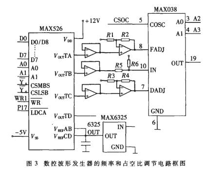 MAX038 的輸出頻率主要受振蕩器電容 CF IIN 端電流 IIN FADJ 端電壓 VFADJ 控制。選擇一個 CF , 對應(yīng)IIN 端電流變化, 將產(chǎn)生一定范圍的輸出頻率。另外, 改變 FADJ 端的電壓, 可以在 IIN 控制的基礎(chǔ)上, 對輸出頻率實現(xiàn)微調(diào)控制。 可通過電壓輸出型的 DAC MAX526 實現(xiàn)輸出頻率的數(shù)控調(diào)節(jié)。MAX038 IIN 端和 FADJ 端分別連接到 MAX526 VOUTA VOUTB 兩個輸出端上。通過 V B 產(chǎn)生 0V( 00H) 2.5V( 0FFH) 的輸出電壓, 再經(jīng)電壓/電流轉(zhuǎn)換網(wǎng)絡(luò), IIN 端產(chǎn)生 0μ A 750μ A 的工作電流, 使之產(chǎn)生相應(yīng)的頻率范圍。VOUTB 將此工作電流范圍分為 256 級步進間隔, 輸出頻率范圍也被分為 256級步進間隔。所以, IIN 端電流實現(xiàn)了對輸出頻率的粗調(diào)。VOUTA FADJ 端產(chǎn)生一個從- 2.4V( 00H) +2.4V( 0FFH) 的電壓范圍, 該范圍同樣也包含 256 級步進間隔, IIN 端的步進間隔再次細分為 256 級步進間隔,從而在粗調(diào)的基礎(chǔ)上實現(xiàn)微調(diào)。各頻段的頻率范圍劃分為 65 536 級間隔。 MAX526 VOUTC DADJ 端產(chǎn)生一個從- 2.3V( 00H) +2.3V( 0FFH) 電壓 調(diào)節(jié)范 , 占空比實現(xiàn)數(shù)字控制, 該范圍包含 256 級步進間隔。VOUTC的每一級步進對應(yīng)著 Δ V=[2.3- ( - 2.3) ]/256=17.9mV V%=( 90%- 10%) /256=0.3125。調(diào)節(jié)占空比時應(yīng)盡量避免輸出頻率發(fā)生變化。僅當(dāng) δ =15%~85% 25μ A<IIN<250μ A , 對頻率影響最小。數(shù)控波形發(fā)生器頻率和占空比調(diào)節(jié)電路的原理圖如圖 3 所示。