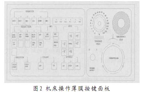綜合實(shí)驗(yàn)裝置由兩部分組成:一部分是數(shù)控系統(tǒng)控制部分;另一部分是伺服放大和電機(jī)等強(qiáng)電執(zhí)行部分。在控制部分,主要安裝有FANUC控制器、CRT/MDI、外置I/O模塊、機(jī)床操作面板、模擬操作和顯示平臺(tái)等。設(shè)計(jì)的機(jī)床操作面板如圖2所示。在執(zhí)行部分,主要安裝兩軸伺服放大、主軸變頻器、主軸位置編碼器、伺服電機(jī)和主電機(jī)、刀架電機(jī)以及機(jī)床電器等,除機(jī)床的機(jī)械部分外,數(shù)控機(jī)床電氣都清楚安裝在實(shí)驗(yàn)臺(tái)上,加上器件透明安裝,容易理解數(shù)控機(jī)床電氣組成。