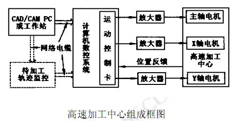 在圖1所示的高速加工中心 , 當(dāng)計算機(jī)數(shù)控系統(tǒng)具有待加工軌跡的監(jiān)控功能時 , 則其可以直接與CAD/ CAM系統(tǒng)通過網(wǎng)絡(luò)連接 , 否則 , CAD/ CAM 系統(tǒng)生成的 NC代碼必須先通過具有待加工軌跡監(jiān)控功能的系統(tǒng) , 然后再被傳送到計算機(jī)系統(tǒng)中 , 如圖中的虛線所示。