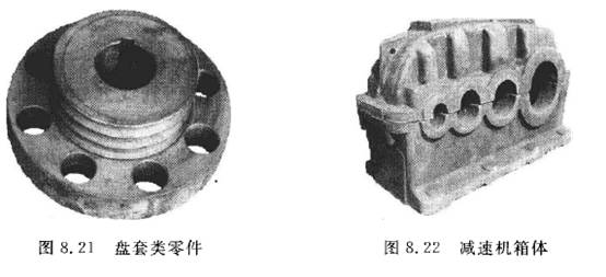 (1)如圖8. 21所示,盤套類零件多指帶有徑向孔或鍵槽、端面,有分布孔系以及有曲面的零件,如帶法蘭的軸套、帶有方頭或鍵槽的軸類零件等。端面有分布孔系、曲面的盤套類零件宜選用立式加工中心,有徑向孔的可選用臥式加工中心。