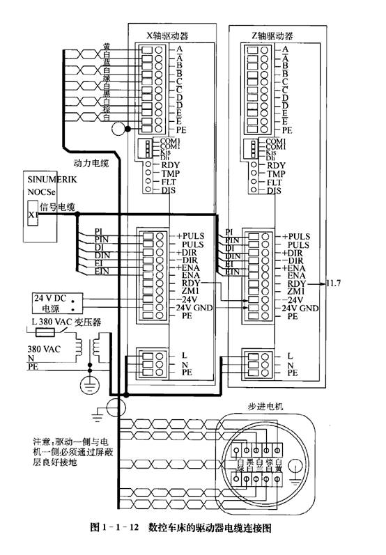步進電動機的控制信號為脈沖信號(PULS)、方向信號(DIR)和使能信號(ENA )。電動機每轉(zhuǎn)給出1 000個脈沖,步距角為0. 36。如圖i一1一12所示為用于數(shù)控車床的驅(qū)動器電纜連接圖,按圖示分別連接電源、信號電纜、電動機電纜。所有的電纜都必須在斷電狀態(tài)下連接。電纜正確連接完畢后,通過DIL開關(guān)設(shè)定與電動機型號相對應(yīng)的電流。
