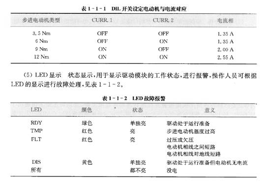 CURR.1, CURR2:電流設(shè)定開關(guān),根據(jù)所選用的步進電動機的類型,通過CURR. 1,CURR.2開關(guān)設(shè)定相應(yīng)的電流值,見表1一1一1