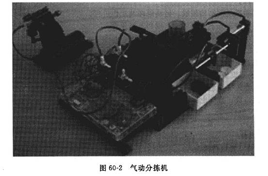 氣動(dòng)分揀機(jī)(見圖60-2)用于分揀黑色和白色的物體。該設(shè)備由氣源、分揀機(jī)和智能接口板組成,共使用了2個(gè)電動(dòng)機(jī)分別驅(qū)動(dòng)空氣壓縮機(jī)和曲柄滑塊機(jī)構(gòu);3個(gè)電磁閥控制分揀撥叉的動(dòng)作;1個(gè)光電開關(guān)用于檢測物體的顏色;1個(gè)限位開關(guān)用來確定分揀撥叉的位置。
