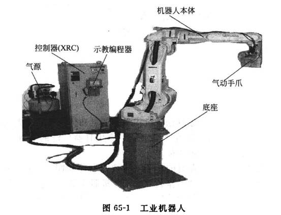 UP-6工業(yè)機器人具有六自由度,該設備主要由機器人本體、控制器(XRC)、示教編程器、氣動手爪、底座和氣源等部分組成,工業(yè)機器人組成見圖65-1 e