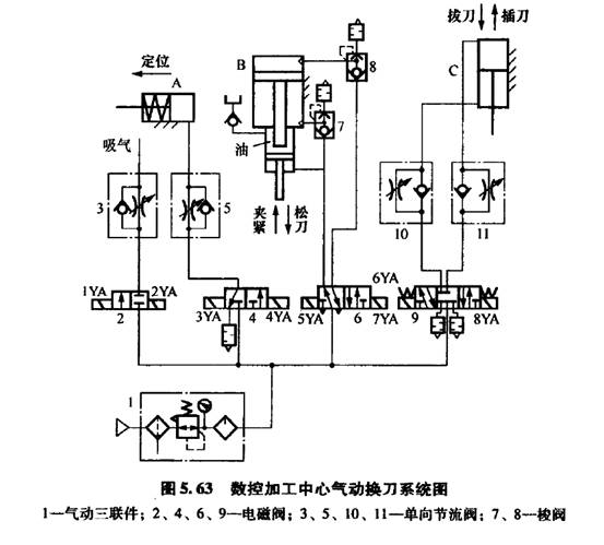 圖5. 63為數(shù)控加工中心氣動換刀系統(tǒng)原理圖,