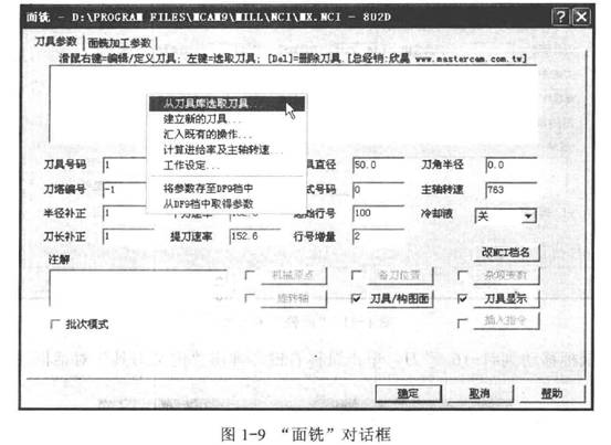 1) 在主菜單區(qū)單擊“回主功能表”,返回到主界面,單擊“刀具路徑”“面銑”“串聯(lián)”,選擇剛才繪出的矩形(高亮顯示),單擊“執(zhí)行”,彈出“面銑”對話框,將鼠標(biāo)移動到中間空自處,單擊鼠標(biāo)右鍵選擇“從刀具庫選取刀具…”,如圖1-9所示。