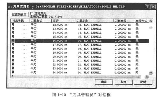 2)系統(tǒng)彈出圖1-10所示的“刀具管理員”對話框,不勾選“過濾刀具”,選擇“平刀”、“直徑16.0000 mm ".單擊“確定”。