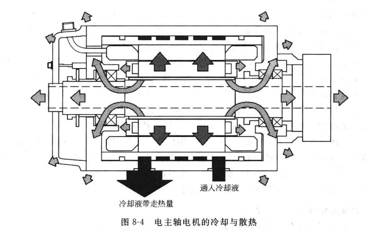 為改進電主軸的熱特性,應采取必定的辦法和設置專門的冷卻系統(tǒng)。圖8—4表示了電主軸電機的循環(huán)切削液冷卻和散熱路徑,在電機定子與殼體銜接處規(guī)劃循環(huán)冷卻水套,水套用熱阻較小的資料制作,套外環(huán)加工有螺旋水格。電機作業(yè)時,水槽里通人循環(huán)冷卻水,為加強冷卻作用,冷卻水的進口溫度應嚴格控制,并有必定的壓力和流量。別的,為避免電機發(fā)熱影響主軸軸承,主軸應盡量選用熱阻較大的資料,使電機轉子的發(fā)熱首要通過氣隙傳給定子,由冷卻水吸收帶走。