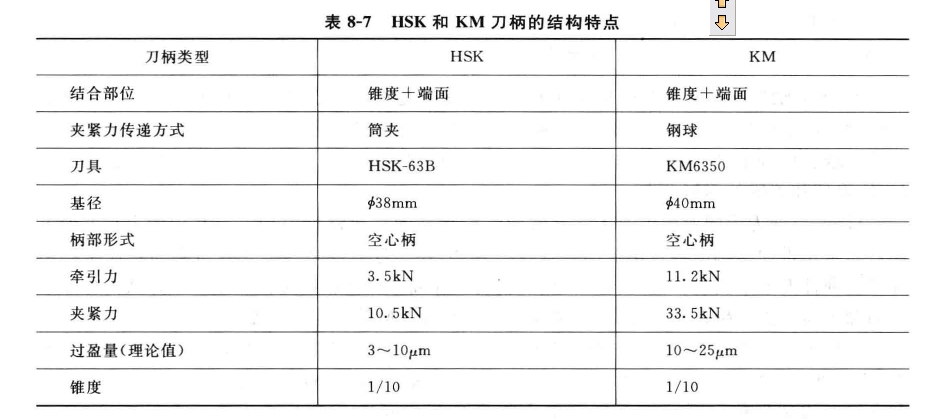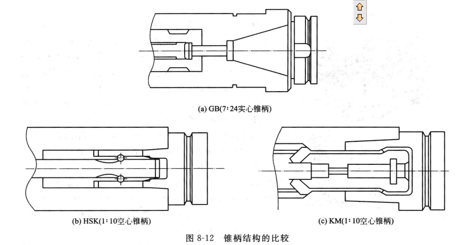 o.o01一o.o025mm),具有適應高速旋轉(zhuǎn)和換刀時間短以及固定與旋轉(zhuǎn)刀具通用等長處,為刀具進步切削功率和加工質(zhì)量,減少磨損及破損創(chuàng)造了條件。因而,此類刀柄特別合適高速切削加工。德國已將HSK刀柄正式歸入DIN69893標ZB,并取得Iso/TC29專業(yè)委員會的認可。HsK與KM作為機床刀具接口或作為刀具體系模塊的銜接辦法,是機械加工向高速切削范疇開展不行短少的一套配置體系。表8—7列出了HsK和KM刀柄的布局特色,三種刀柄的布局比較見團8—12。