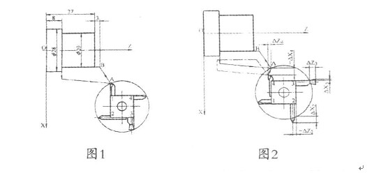 中的一把常用的刀稱為基準刀,把其它的刀稱為非基準刀。如果刀位偏差為零,如圖1所示,則每一把刀轉到加工位置時,其刀位點都應在圖1A所示的位置。但由于每一把刀的幾何形狀及其安裝位置的不同,不同刀位上的刀具轉到工作位置時,它們的刀位點的位置并不重合,如圖2所示,而在X、Z向存在一定的偏差。我們將非基準刀的刀位點相對于基準刀的刀位點(或基準點)在X、Z向的偏差ΔΧ、ΔΖ稱為刀位偏差(簡稱刀偏)。