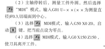 (1)用外圓車刀先試切一段外圓,按功能鍵POS,按軟鍵[(OPRT)],當未顯示[WRK-CD]時,按菜單繼續(xù)鍵>,按軟鍵[WRK-CD],輸入X0,按軟鍵[AXS-CD]。